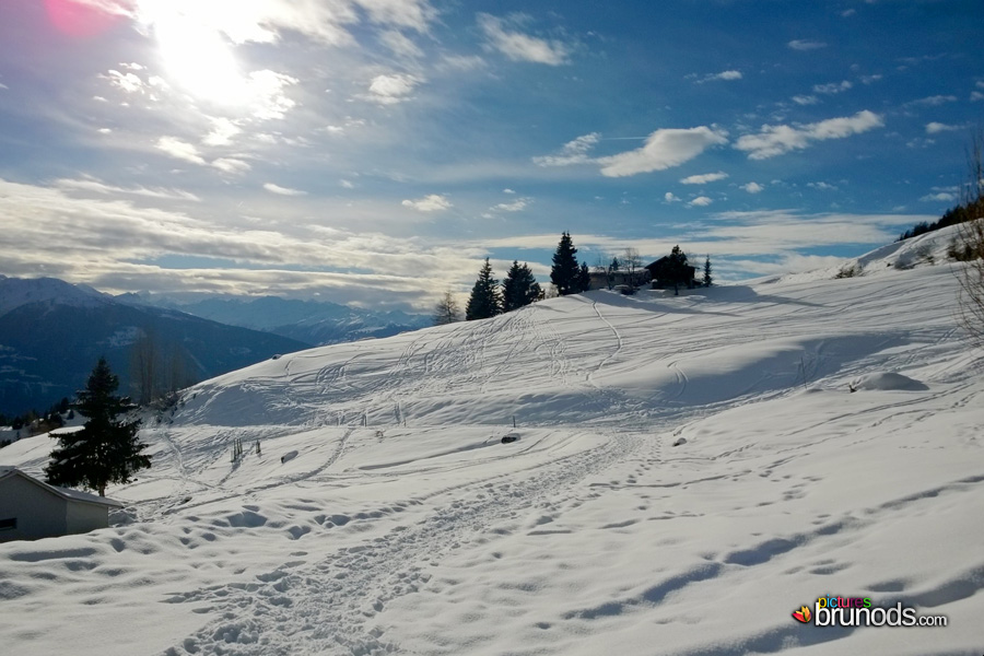 En lieu et place d’une journée à ski, nous avons donc opté pour une promenade à raquettes du côté d’Aminona au vu de faible enneigement sur les pistes de ski! Le début de cette randonnée…